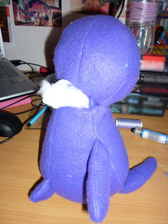 2) Coloque el cabezal en la abertura del cuello del cuerpo. Puesto que el cuerpo y las piernas son rellenas, el diggle pueda sentarse cómodamente mientras trabajas :)