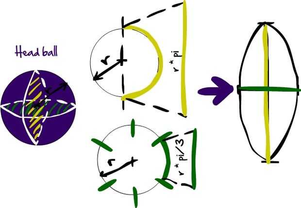 3) la línea (verde) más corta será la sexta parte de la circunferencia de la bola, o un tercio de la línea amarilla: