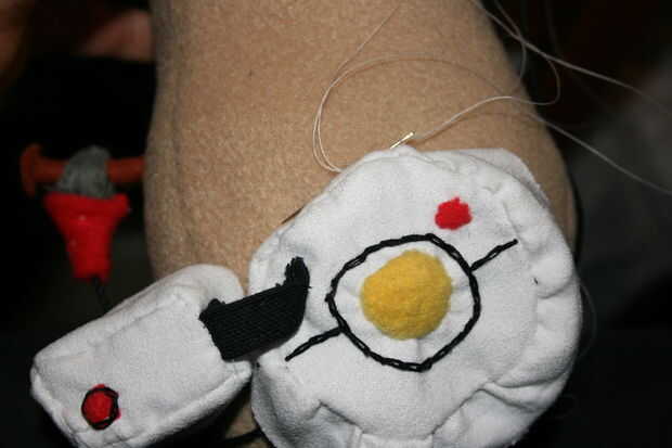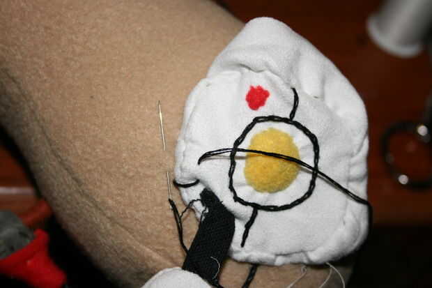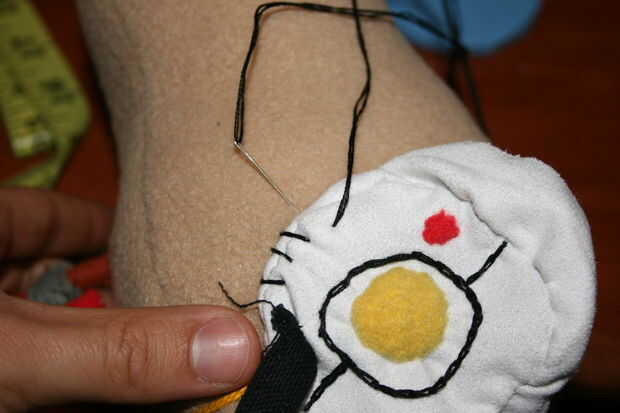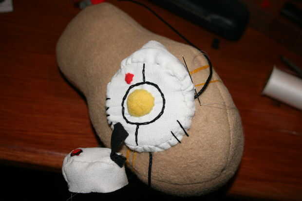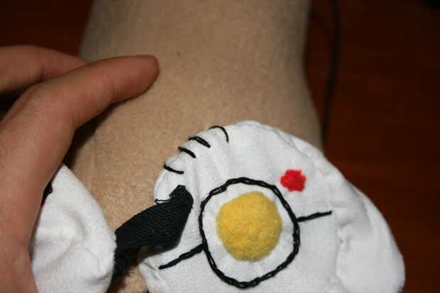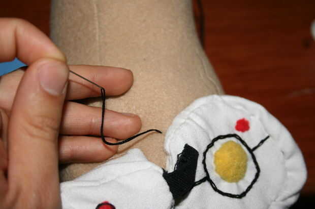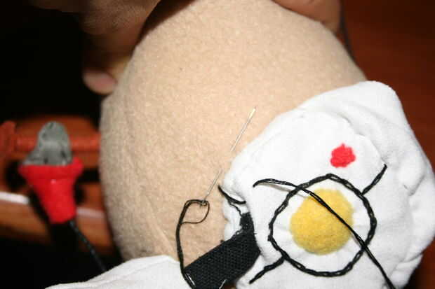 Con eso hecho, puede volver a coser alrededor de la cara. Si está usando la almohadilla de espuma para rellenar la cara, corte e inserte su círculo de espuma ahora, mientras que la mitad de ella todavía está abierto. Si está utilizando relleno de fibra regular, mantener la costura hasta que queda sólo una pequeña abertura antes de cosas, luego terminar el trabajo cuando está lleno.