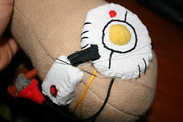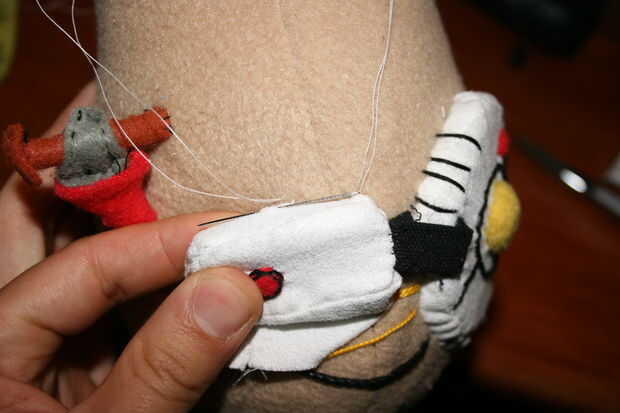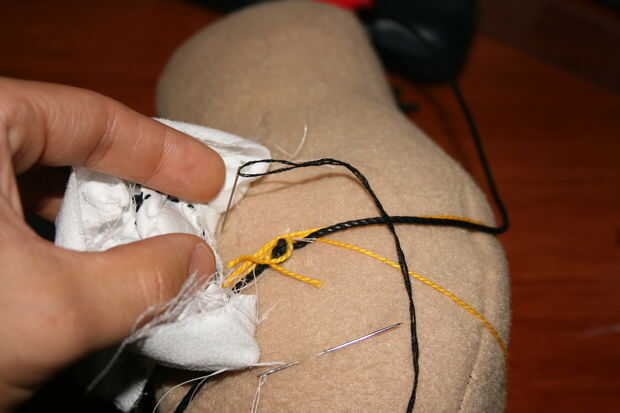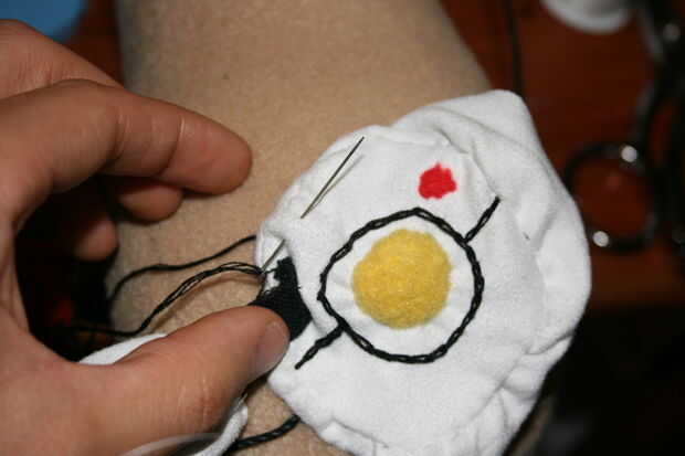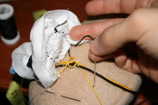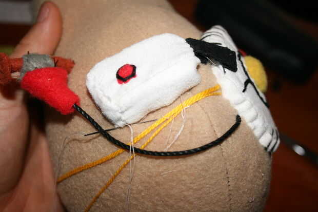El chip de ordenador rectangular se asegura del mismo modo, con una puntada de resbalón alrededor de los bordes. Asegúrese de iniciar en el borde más cercano a la cara, si no la tira negra de entre ellos podría conseguir de su manera más adelante. Recuerde dejar espacio suficiente para cosas antes de la costura hacia abajo todo el camino.