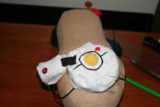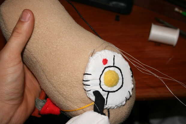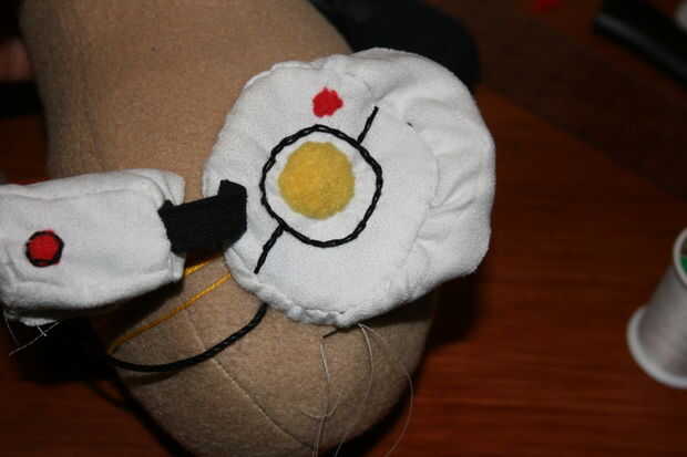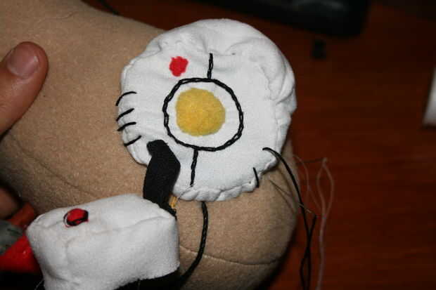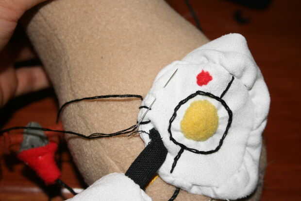 Con el lado derecho de la cara abierta se puede obtener por debajo para añadir los alambres de apuñalamiento en la patata de la cara. Tire hacia atrás el blanco de la tela y el hilo de bordar en la patata del ancla. Llevar la aguja hacia arriba a las afueras de la cara donde el primer alambre se supone conocer a Papa. Meter la aguja en la tela blanca para completar la ruta del primer alambre. Llevar la aguja de atrás en donde la aguja siguiente comienza y ejecútelo nuevamente en la patata. Continuar así hasta que hay cuatro hilos que se pega en la patata. Asegúrese de que usted no tire estos hilos de rosca demasiado apretado o trituran el lado de la cara de GLaDOS. Ate el extremo de la patata debajo de la cara donde empezaste. Utilice el mismo método para añadir dos cables más a la parte inferior de la cara.