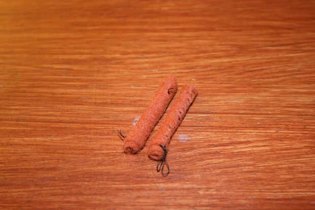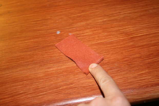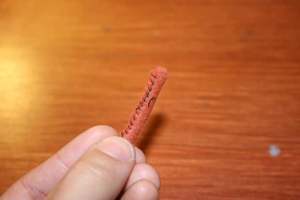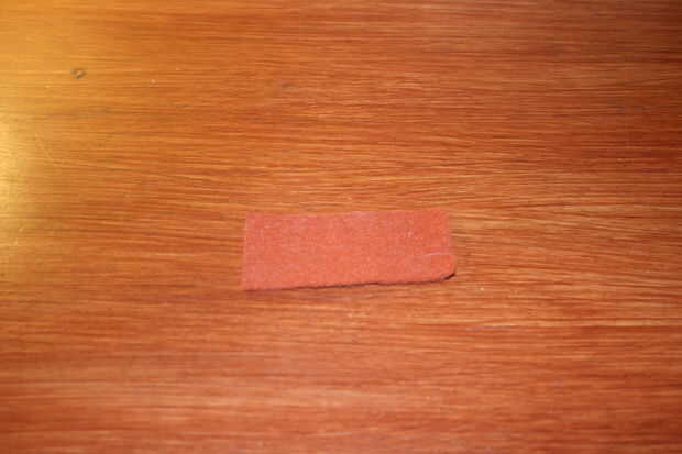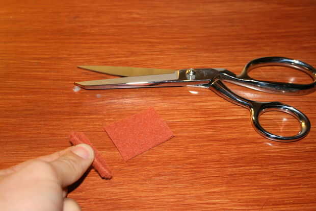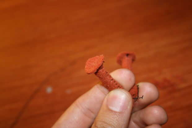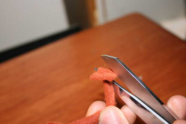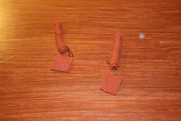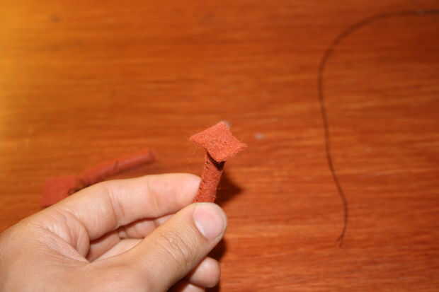 Clip a un cuadrado alrededor de tres cuartos de pulgada a cada lado y la pongo en un extremo de uno de los rollos. Puntada hacia abajo y deslice la afeitadora de las esquinas de la plaza para que sea una cabeza circular del clavo. Hacer esto para ambos rollos.