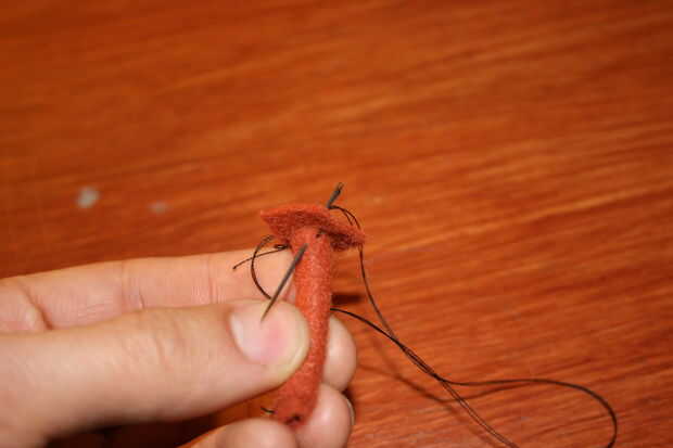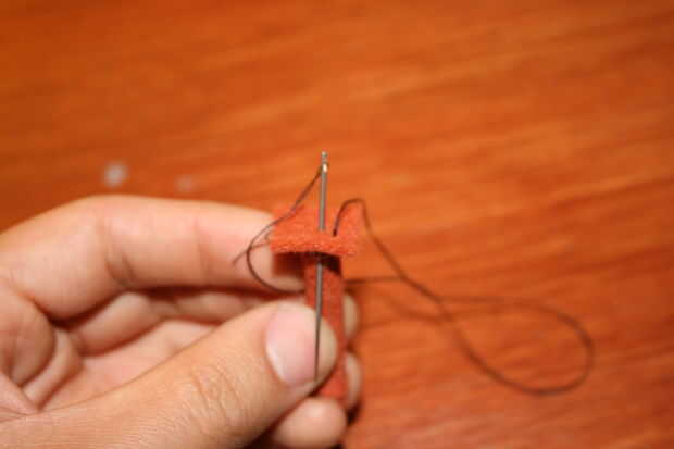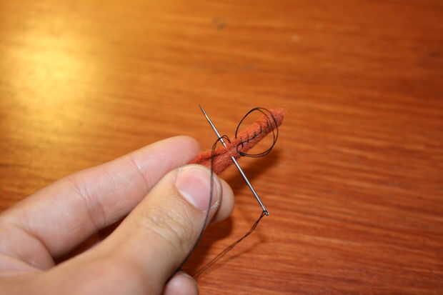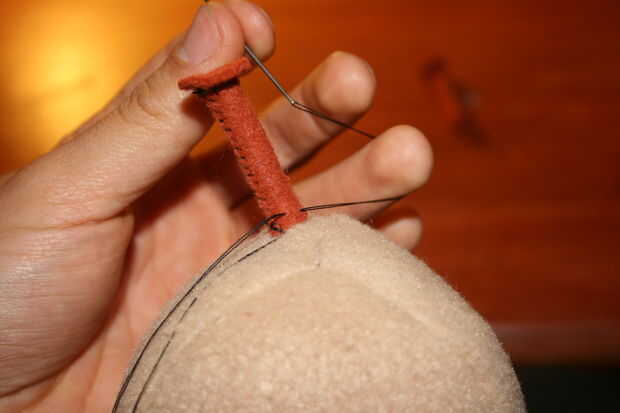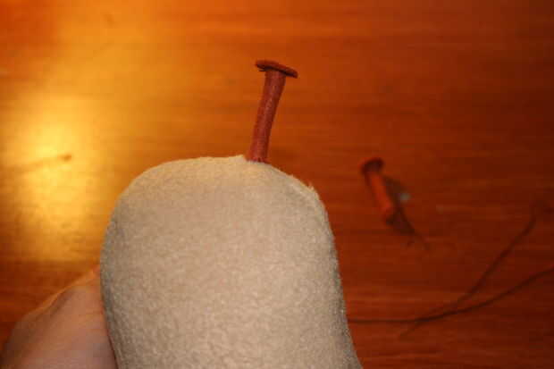 Ahora debe tener dos clavos para coser sobre la patata en su parte superior y lateral como se muestra.