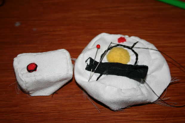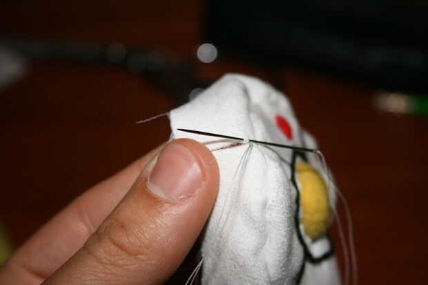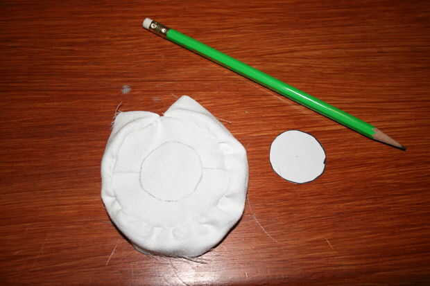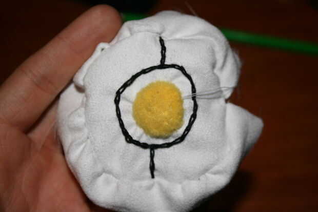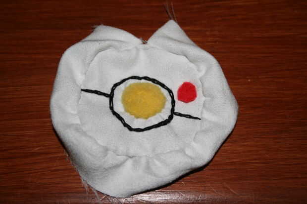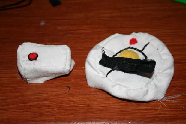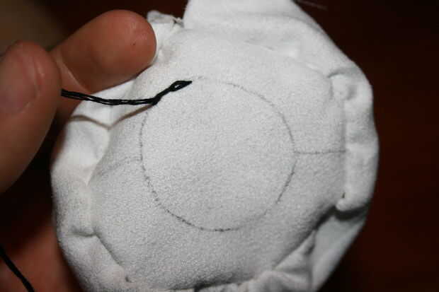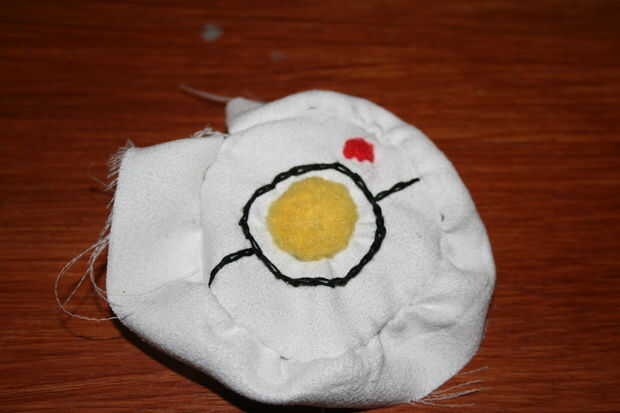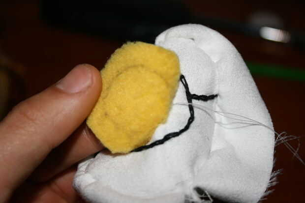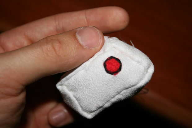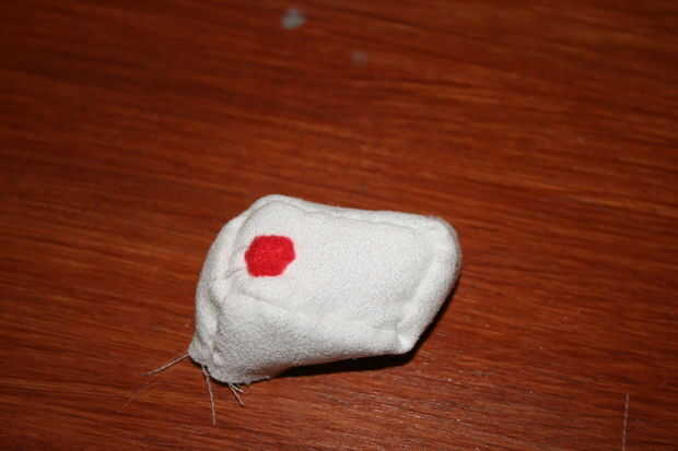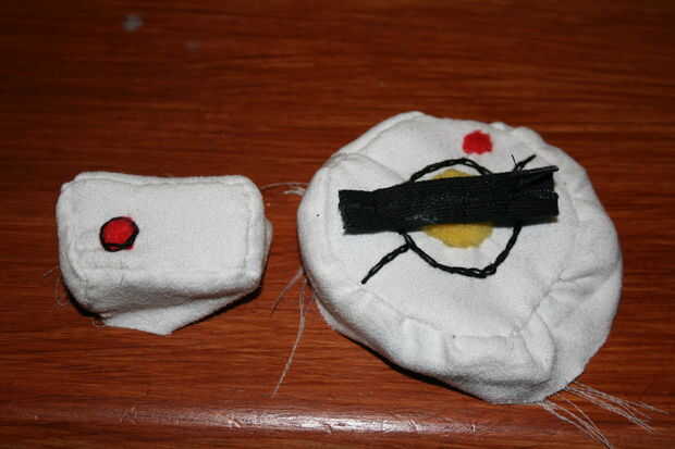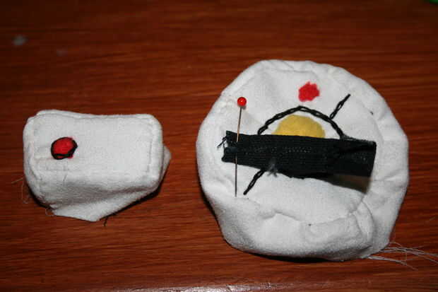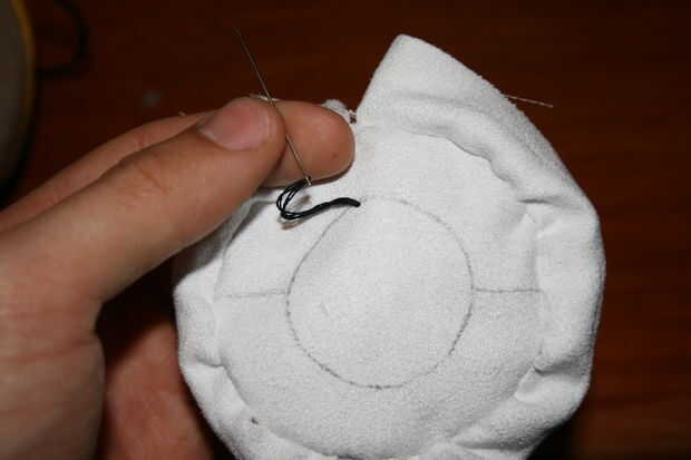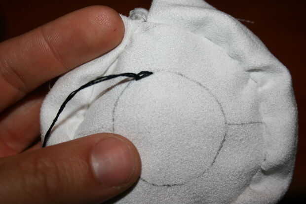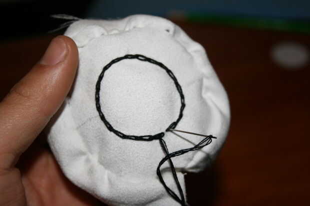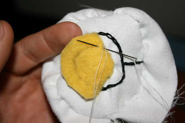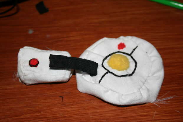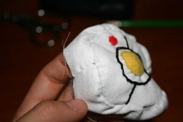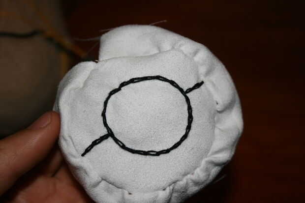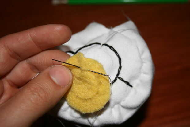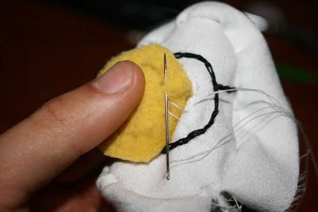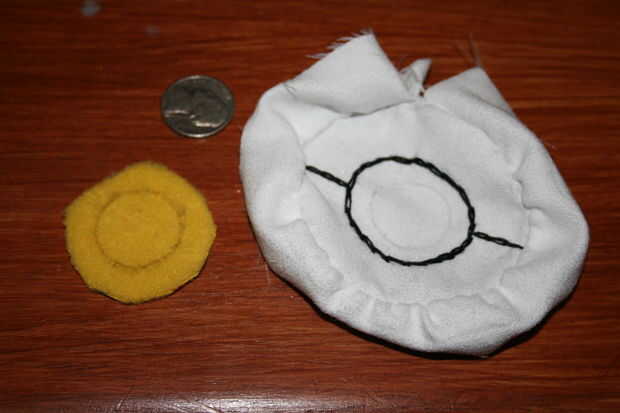 Para el ojo, traza alrededor de un centavo en su tela amarilla. Corte fuera de la línea para cortar la forma. Utilice el níquel para trazar el círculo mismo de cara al centro de GLaDOS. Con el hilo blanco, realice una puntada de deslizamiento entre las dos líneas que trazó, remetiendo los bordes abajo como que la puntada. Las pequeñas luces rojas en su cara y otras partes de la computadora son añadidas de la misma manera, pero con círculos más pequeños cortar de la tela roja.