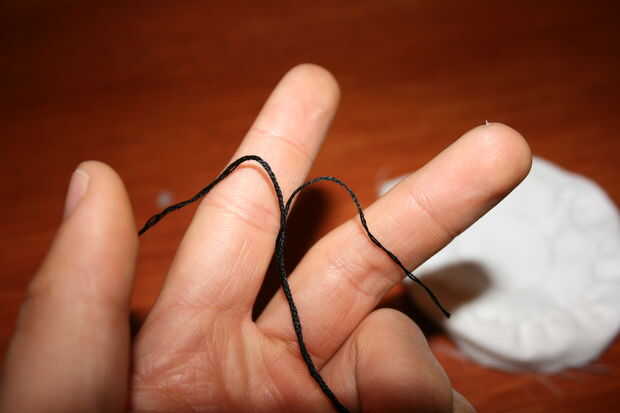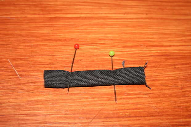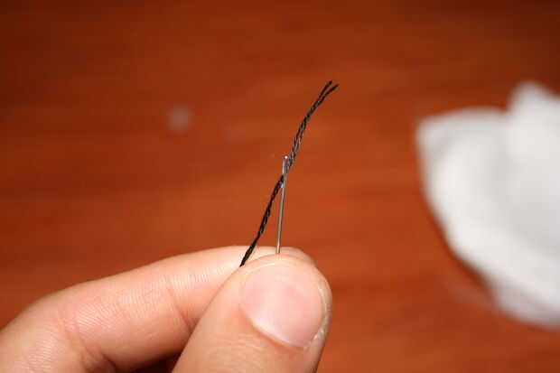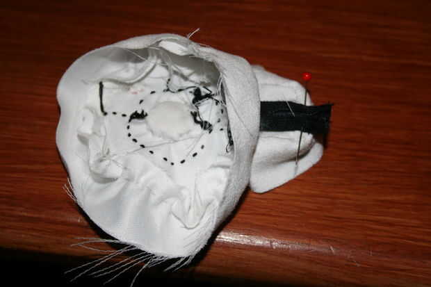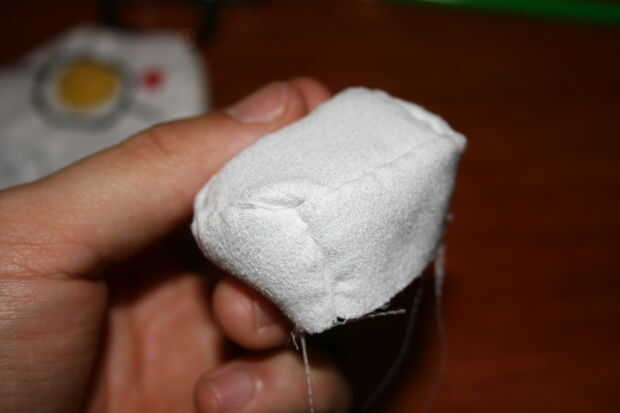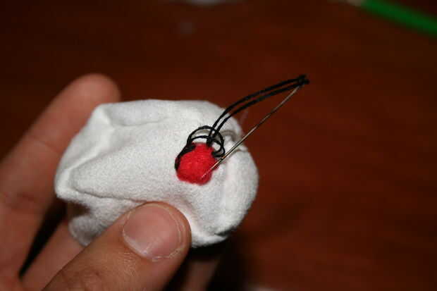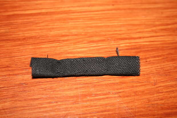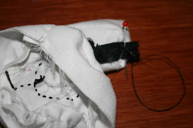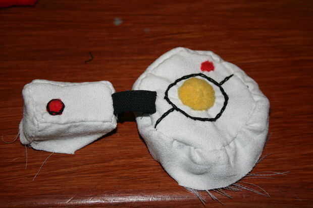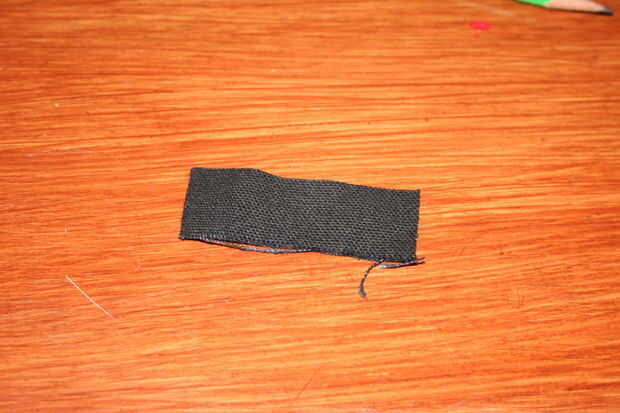 Cortar una tira de tela negra sobre una pulgada de ancho. Doblar los bordes y utilizar una puntada corriente en hilo negro para mantener en su lugar. Encontrar el lugar en la cara de GLaDOS donde la tira negra se conecta y ejecuta nuevamente al otro chip. Perno de la tira negra de aquí, con el lado malo hacia arriba y el extremo más largo que atraviesa el ojo. Puntada hacia abajo con un punto de funcionamiento y doblar donde los puntos son para que el borde está oculto debajo del resto como va detrás en el chip de ordenador. Asegure el otro extremo al borde del rectángulo blanco usando el mismo método.