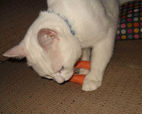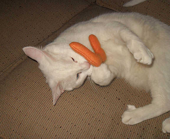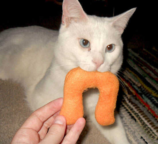 Usted está terminado y listo para jugar. Mi gato fue una locura para este juguete inmediatamente! De hecho, tuve que hacer una segunda para el gato de mi hermano porque Kermit escupe todo sobre éste en los primeros 5 minutos de la terminación. Fue muy gratificante ver que le gustaba mi esfuerzo hecho a mano. Verlos jugar con un peluche-stache es un motín! Nunca pude ajustar la cámara a tiempo para capturar un momento bigote, pero he cogido le lleva todo el apartamento varias veces, como Sam de Yosemite.