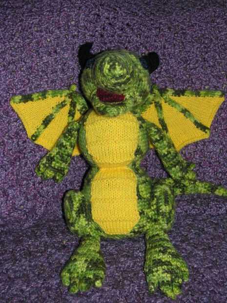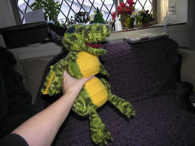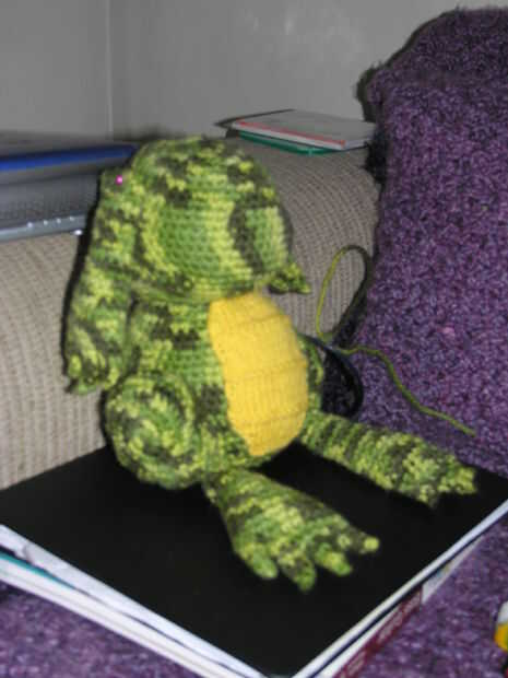 El cuerpo se hace del hilado clásico de arco iris de sensaciones, que creo que está hecho exclusivamente para los almacenes de Jo-Ann - puedo equivocarme. Todos los hilados de negro y amarillo es lana-facilidad de León, la lengua está hecha de Jiffy de León, y los ojos son Glitterspun de León. Se rellena con poliéster fiberfil, excepto su cerebro, que (como se muestra) se hace fuera de tela de tres Stooges, porque yo tenía unas tiras de chatarra y de alguna manera parecía apropiado.