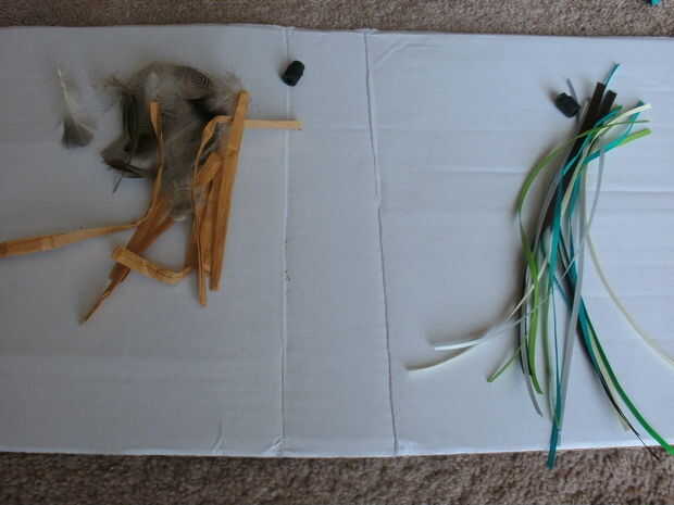 Quería recrear un juguete de Señuelos de pesca que mis gatos amaba y destrucción (también ya tenía los materiales), así que uno de mis Señuelos hecho con rafia y plumas. Los otros Señuelos hecho con cintas toma un juguete de catnip que aman con la cinta en los extremos, pero no es un juguete de señuelos.