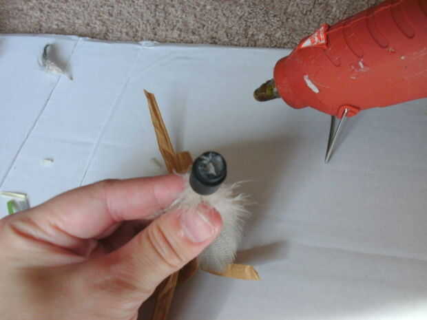 Para ambos señuelos, agrupar la cinta/rafia y poner una gota de pegamento caliente en la parte superior y difunda en los lados un poco. Antes de que el pegamento se haya enfriado, tirar en el extremo opuesto de la cinta/rafia hasta que el extremo pegado encaje dentro de la hebilla de desenganche. Dejar secar completamente y asegúrese de que están pegados bien. Recuerda que los gatos son destructivos!