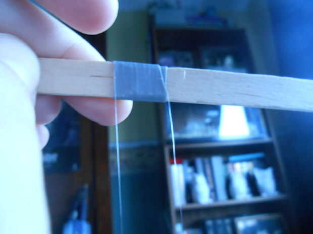 -Cortar una pieza fina de cinta adhesiva, mina fue sobre una mitad de una pulgada y enróllelo alrededor de las muescas y nudo en el palo del popsickle. Ejecutar a través de los dos pedazos de hilo de rosca una vez que llega y seguir envolviendo.