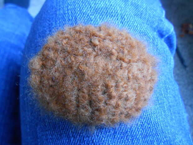 -Ronda 2: sc en la primera puntada, inc. en los próximos 2 puntos de sutura, sc en el siguiente 4 puntadas, inc en los próximos 2 puntos de sutura, sc en los 3 últimos puntos (16)