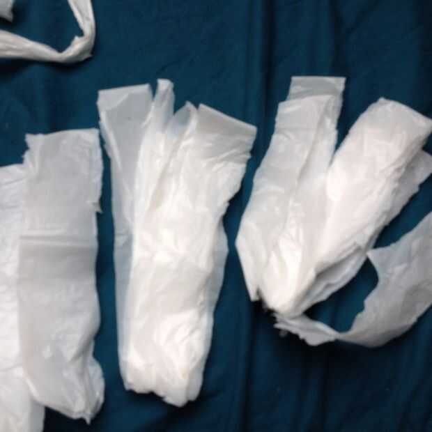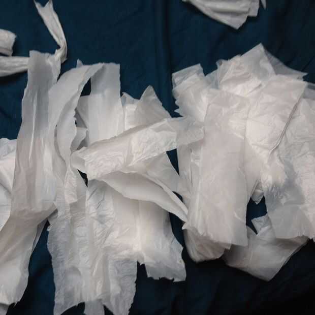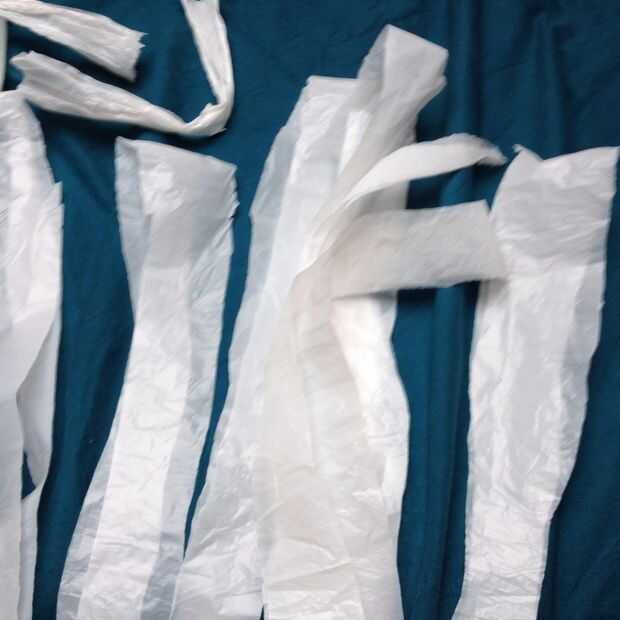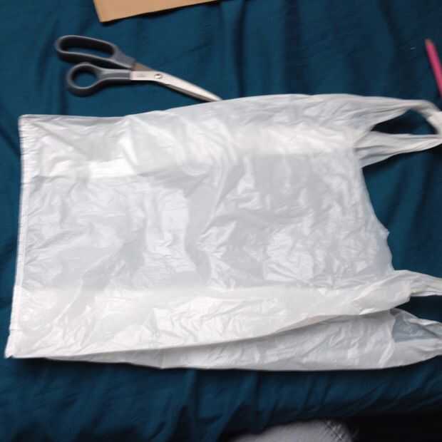 Tomar su bolsa de plástico y cortar la parte inferior y las asas para que se queden con un tubo. Puede mantener estos bits como todavía puede ser utilizados en el paso siguiente.