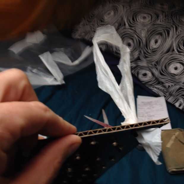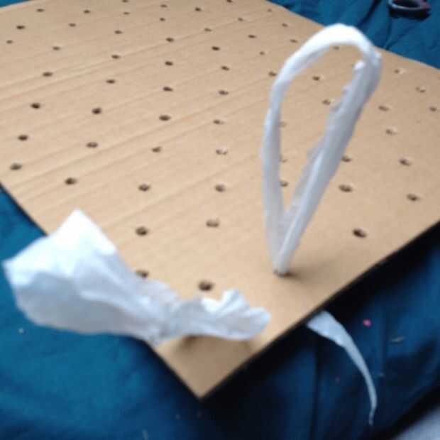 Una vez que haya suficientes tiras para cubrir su inicio Junta alimentarlos a través de modo que formen bucles con el extremo abierto todavía por debajo de la base. puede utilizar el lápiz para ayudar a prod el plástico a través de.