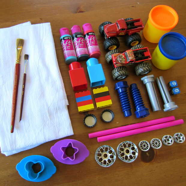 -Juguetes - reunió a camiones con voluminosos neumáticos, latas de play-doh, tornillos de plástico y clavos, dados, ruedas de coche (grande y pequeño) de legos, tinker toys, etc..