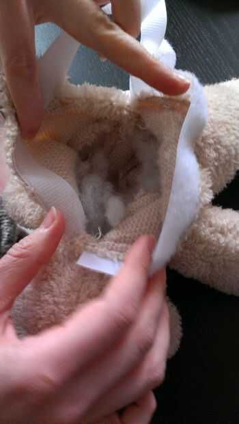 Bromas aparte, es importante abrir el juguete de la felpa de la manera más limpia posible, para poder colocar en la parte posterior junto al final.