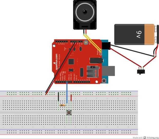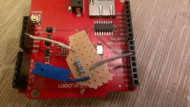 1) el botón conecta el + 5V al pin 5 del escudo, uno de los pocos pasadores izquierda disponibles en el escudo de Sparkfun MP3. un desplegable de 10kOhm conecta el perno 5 en el suelo.