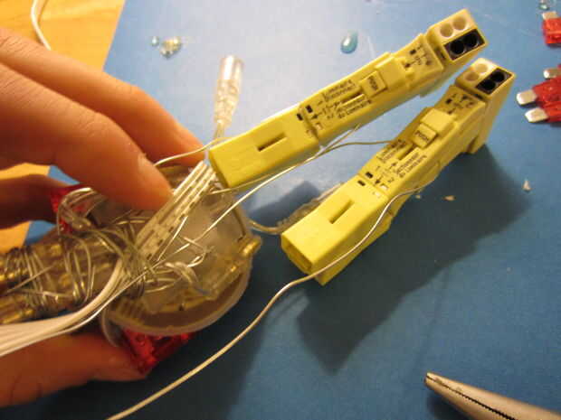 También pegué dos de los restantes conectores impermeables a los lados de las piernas para darles más de un aspecto industrial.