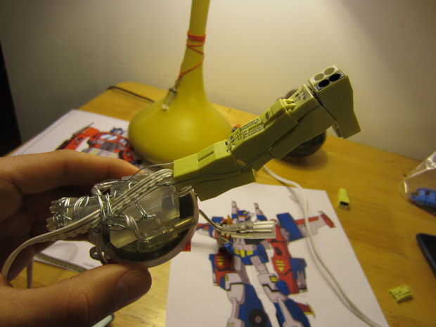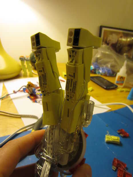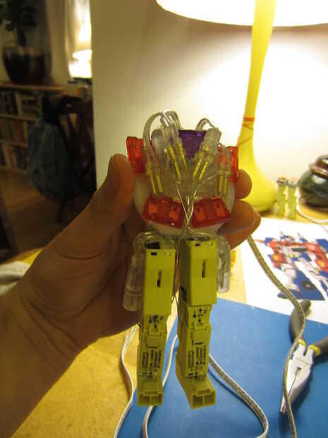 Terminé de crear bucles un alambre a través de una brecha en las piernas (alrededor de la articulación de la rodilla) hacia arriba en el torso para que libremente se celebró cada pierna al cuerpo como se muestra. Después de eso, el resto de pegar era fácil. Me aseguré con un montón de pegamento caliente para llenar todos los huecos alrededor de la articulación de la cadera y baja detrás de la Glowbot.