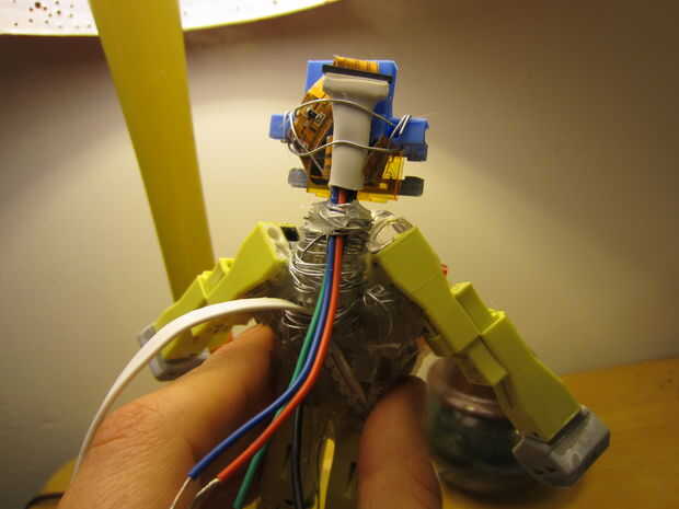 Yo también envuelto un alambre alrededor del cuello de tal manera que los cables RGB sobresalga a un ángulo hacia abajo de la parte posterior de la Glowbot de la fuerza. Esto hace más fácil conectar los cables que salen del controlador RGB para la cabeza.