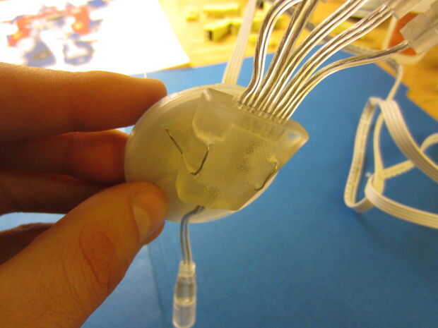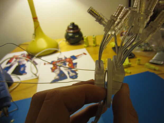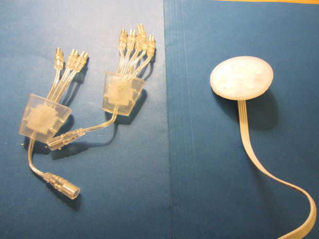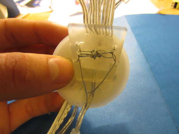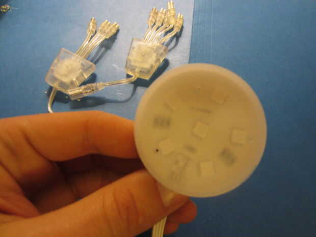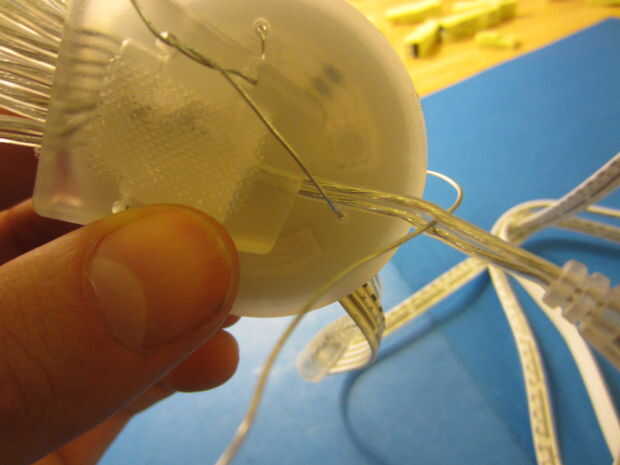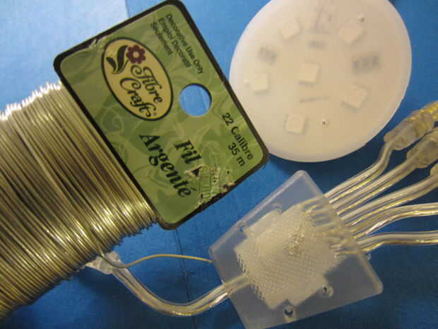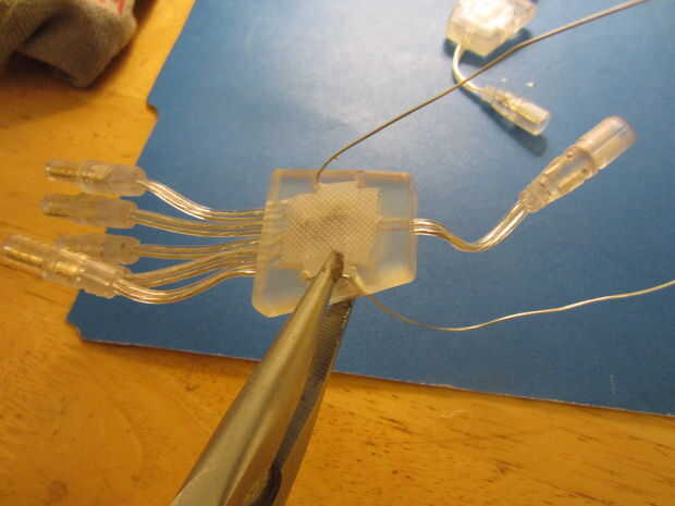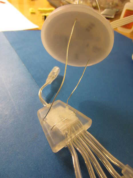 Usé alambre de arte de 22 calibre (gauge) para "coser" el duende malicioso en un sándwich entre los dos divisores de 5 vías. Los divisores ya tienen pequeños agujeros precortados en ellos pero he añadido mi propia a la luz de disco utilizando un alfiler.