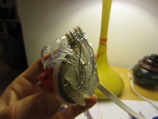 Con dos alambres del impermeable LED separador enchufes dejó sin cable (que se pega para arriba), luego alambré abajo más cerca al cuerpo para dar un fuerte apoyo a la cabeza. La mejor manera que pude pensar que tire de ellas hacia abajo era volver a utilizar mi alfiler para empujar los agujeros pequeños entre cada uno de los conjuntos de cables para dar mi alambre artesanales en algún lugar "coser" a través de. Usted no tiene que preocuparse de dañar los cables eléctricos porque nunca va a ser conectados en cualquier cosa.
