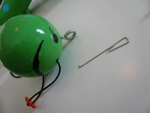 Una vez que ha alimentado el cable a través de los orificios superiores en todas las secciones del cuerpo, es hora de fijar la cabeza. La perilla de bola que usa para el había una pequeña cavidad en el cordón fue duro alimentar directamente a través de. Esto es donde el clip de papel viene muy bien. Endereza el clip de papel y doblar un "gancho" muy pequeño en un extremo. Alimentan el cordón elástico en el orificio en la parte posterior del cabezal. Entonces usando el gancho en el clip de papel, coge la cuerda elástica y tire de ella a través del agujero frontal.