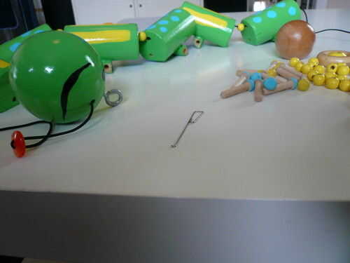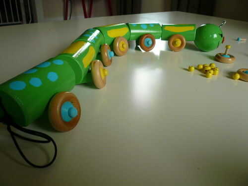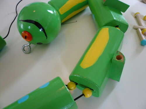 Una vez, lo alimentan a través del botón "la nariz" como se muestra en las fotos y luego a través de la cabeza. Una vez que termines con la pieza de cabeza, alimentación de la cuerda elástica a través de todas las piezas de cuerpo pero esta vez utilizando el orificio inferior de cada sección del cuerpo. Y no olvides añadir un grano entre cada sección en este paso también.