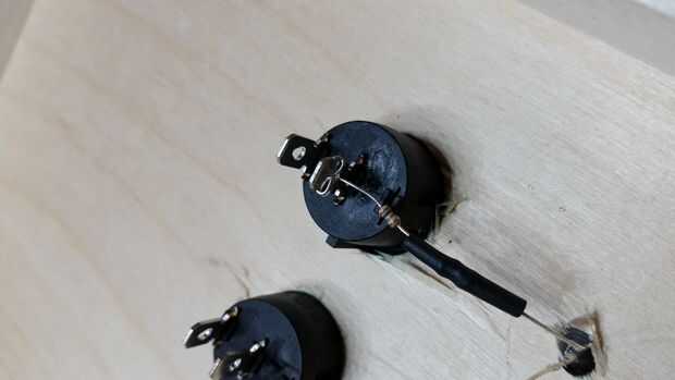 Conectar la pata larga de cada uno llevó a la resistencia de tamaño adecuado (150 ohm para rojo, verde de 75 ohmios). Continuación, pase el otro extremo de cada resistencia a través de uno de los terminales del interruptor Mantenga las cosas en su lugar. Si usas del encogimiento del calor de la tubería, no quiere envolver al terminal de interruptor de todavía o no podrás conseguir el tubo en más adelante. Honestamente, encontré el tubo más apuro que valió la pena y si tuviera que hacerlo otra vez, probablemente usaría cinta aisladora en lugar de otro.