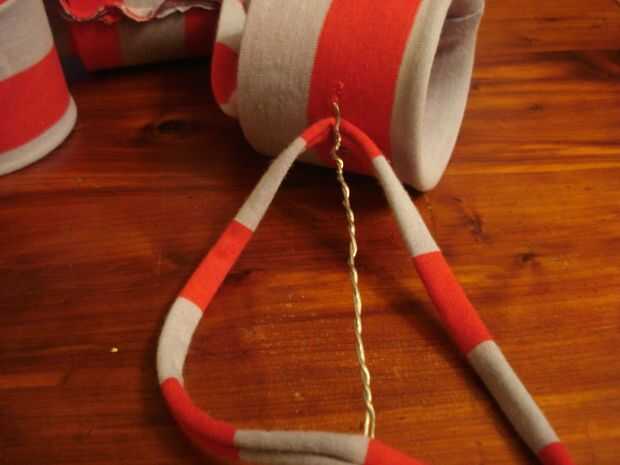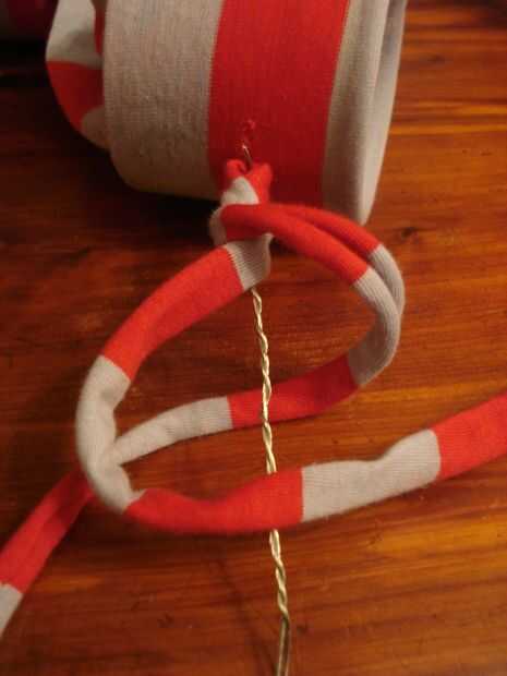 empezar a trenzar la tira de tela alrededor del alambre. con cada paso de la tela alrededor generalmente retorcer el cable un par de veces, que esto es para asegurarse de que usted está firmemente atar las 3 piezas juntas.