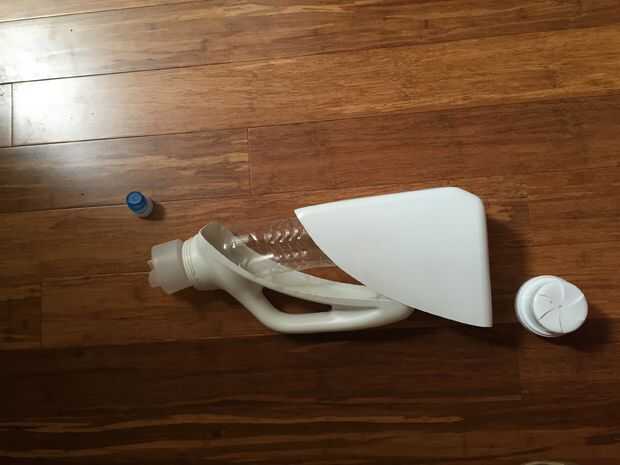 La botella de agua se forma entre las dos secciones con la boca de la botella de agua dentro de la boca de la botella de lavado. Ayuda a hacer un ajuste seco en este punto para ver si necesita alguna de las piezas de forma diferente. Como veis que he quitado un pequeño borde de la parte inferior de mi botella de lavado para que Ud. no tiene una forma del triángulo.