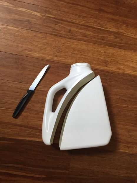 Usando el cuchillo de sierra, cortar la botella en dos secciones. Corte suavemente con un movimiento de sierra. He seguido una línea de diseño inherente en el plástico pero también podría marcar sus propias pautas. No cortó ambos lados al mismo tiempo, pero fue más bien alrededor de la botella. El objetivo era tener una sección de mango más fina con la apertura de botella unida y una sección redondeada más grande que la parte posterior de la pistola.