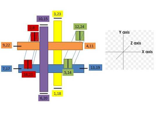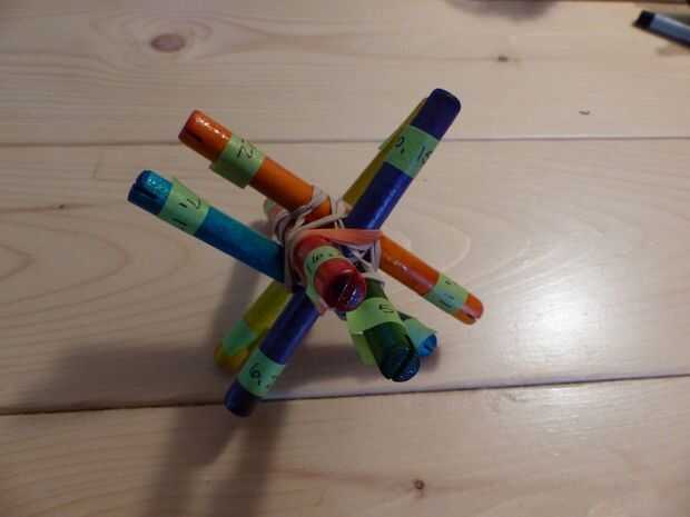 Las piezas de madera están dispuestas en tres pares paralelos en cada eje de un espacio tridimensional xyz tres. Así que si observas el esquema (Foto 1), los cilindros morados y amarillos están en un plano, el eje Y. Los cilindros azules y naranjas son en horizontal eje de X y luego el verde y rojo cilindros sobre el eje Z (que se pega directamente de la página).