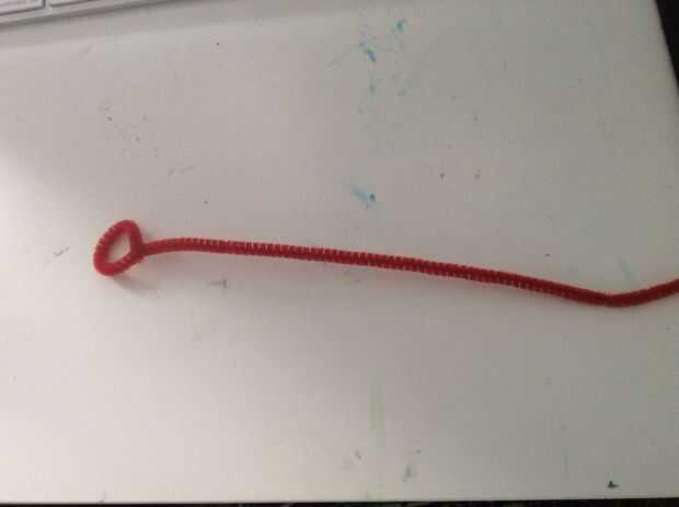 Tome el limpiador de pipa con el lazo. Ate el otro extremo a la cuerda con ella. Si es necesario, reforzar tomando el otro extremo y torcerlo.