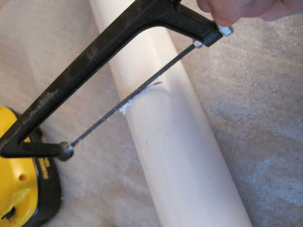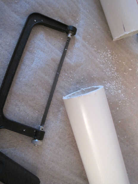 El primer paso de esta guía es para cortar el tubo de PVC a la longitud deseada. Decidí hacer un poco más grande que uno de sus otros juguetes para darle algo de peso por lo que cuando ella empuja alrededor, solo no deslice por el suelo derramando su contenido por todas partes. Marque la longitud deseada con el marcador y cortar con la sierra para metales. Cuando se corta gratis, lije los bordes hasta que quede suave.