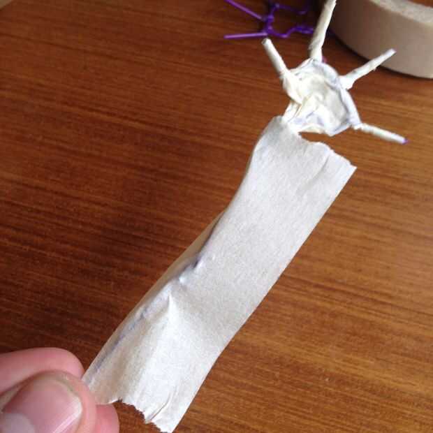 Tome la cinta de enmascarar y envolver las extremidades y el torso, que cubre las articulaciones, pero dejando los extremos sin articulado claro.