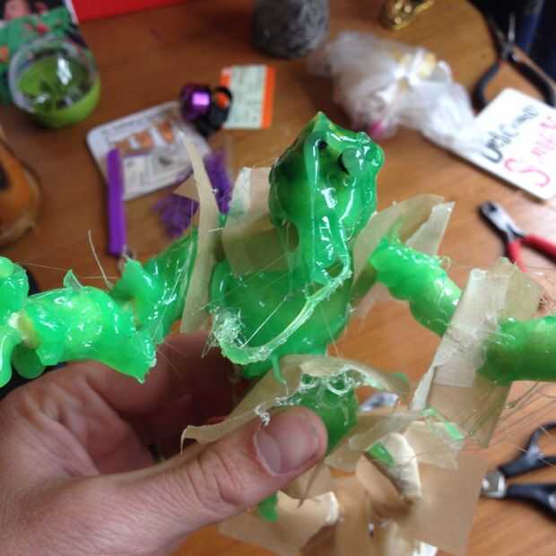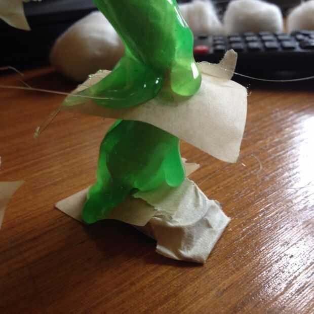 Cuando se trata de los pies, colocar un poco de papel/de la hornada pergamino sobre una superficie plana a prueba de grasa y soporte de su monstruo en él antes de aplicar el pegamento. Esto hará que sus pies estén planos en la base y él puede estar parado (será un poco inestable debido a la naturaleza aleatoria del pegamento)