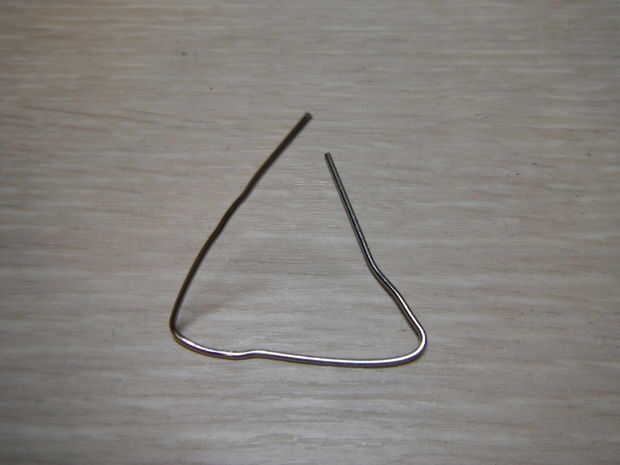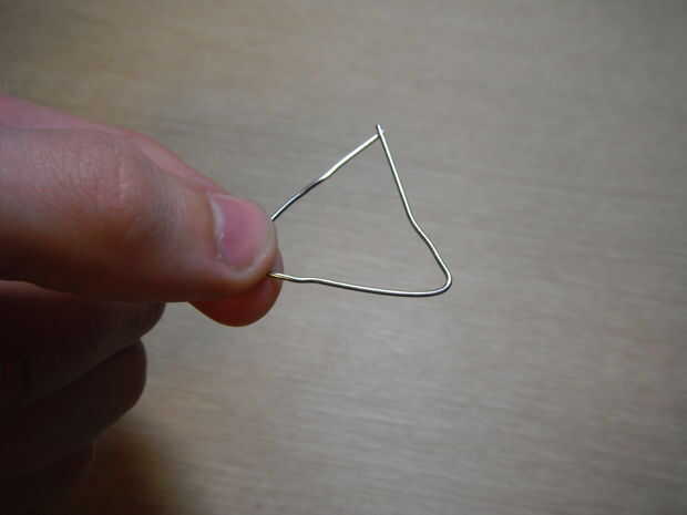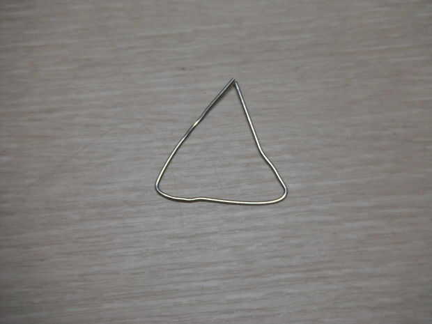 Doblar el clip en un triángulo equilátero como se muestra. Luego, separe los dos extremos. Para usar el juguete, se superponen los extremos superior e inferior y a continuación, colocar el triángulo en el suelo. Si todo va bien, debería pop detrás aproximadamente tan alta como se cayó de arriba. Si no, seguir trasteando con él hasta que hacerlo bien.