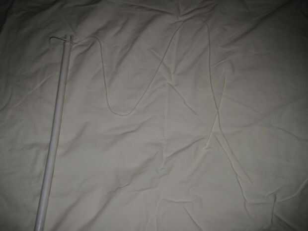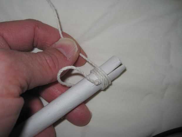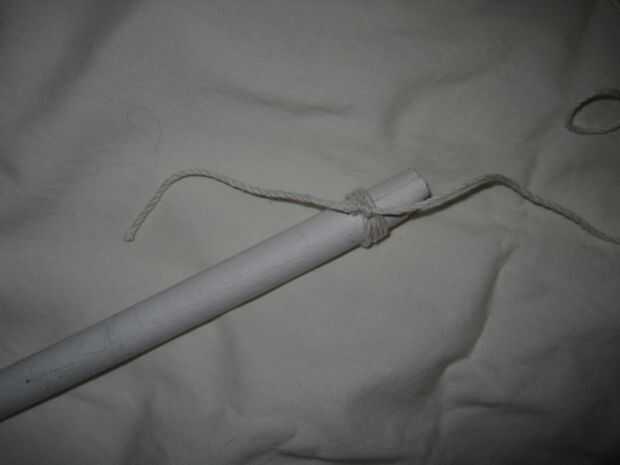 Envolver el lado largo de la cadena alrededor de la porción rasgada del tubo, sobre el nudo. Lazo para el lado corto de la cuerda con un nudo cuadrado. Asegúrese de mantener la tensión en las vueltas como hacer el nudo (otra opción es ejecutar el lado largo hacia atrás por las ranuras de nuevo para mantener la tensión,
