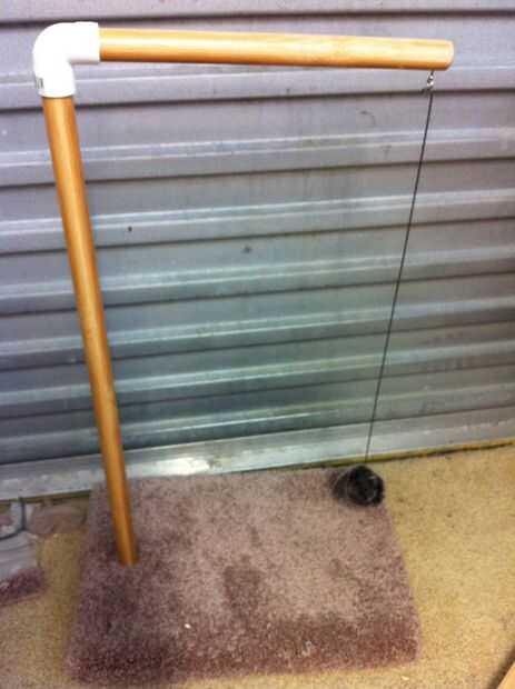 Enganchar el cable a la vista, el juguete debe ser unos 10mm desde la base. Si el juguete está demasiado cerca de la base, volver a doblar el alambre más corto. Si el juguete está muy lejos de la base, cortar el palo de escoba vertical ligeramente más corto. ¡ Recuerde! el juguete se sentará un unos 10mm más cerca a la base después de martillo el codo hacia abajo (en el paso 6. No martíllelo hacia abajo todavía!)