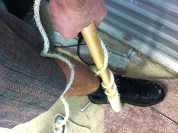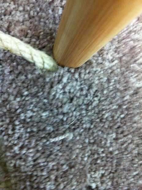 Con una cabeza plana Destornillador, un espacio entre la alfombra y el palo de escoba, lo quiero hacer es crear un espacio al final de la diapositiva uno de la cuerda del hessian en la cuña. Una vez en mi pistola de grapas para tratar de sujetar la cuerda, no era súper efectivo! Pero aún hizo el truco. Sugiero tal vez usando una pistola de pegamento en su lugar.