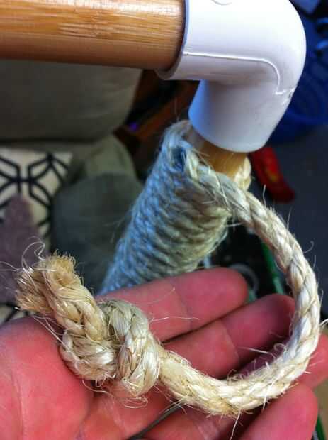 Algunas cuerda el palo del viento hacia la derecha, luego empujar la cuerda hacia abajo para compactarla, periódicamente la zona detras de la escoba de agarre y gire hacia la derecha para apretar. Repita esta acción hasta llegar a la parte superior.