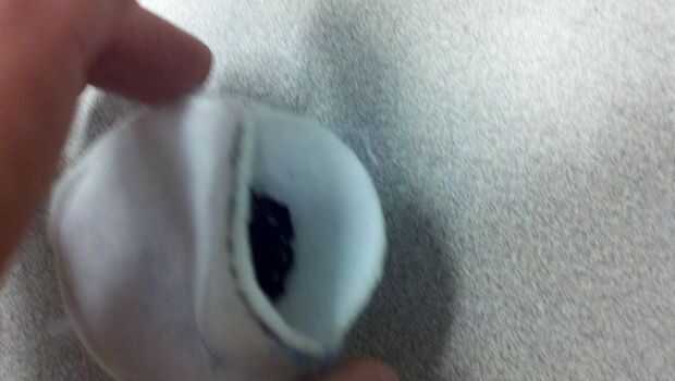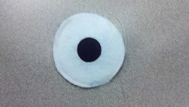 Láser corta dos círculos de diámetro de 2.5 pulgadas de fieltro blanco. Láser corte un orificio de 0,8 pulgadas en el centro de los círculos de fieltro blanco. Corte una sección de malla negra y coser sobre la parte posterior del orificio de 0,8 pulgadas. Coser las dos piezas de fieltro blanco, dejando una abertura en la parte inferior. Usar una perforadora hacer un agujero en la parte posterior del ojo. Esto es donde los cables de LED serán alimentados aunque. Repita estos pasos para el otro ojo.