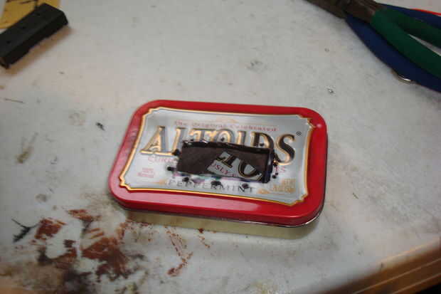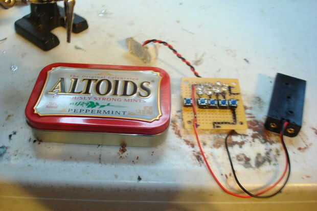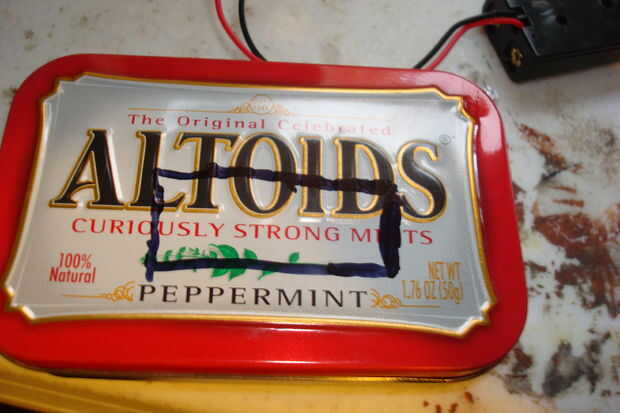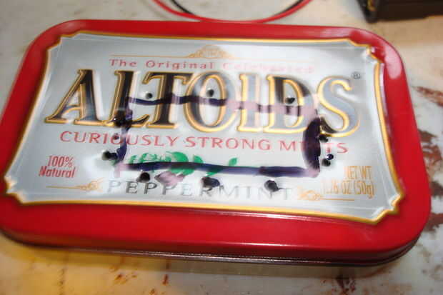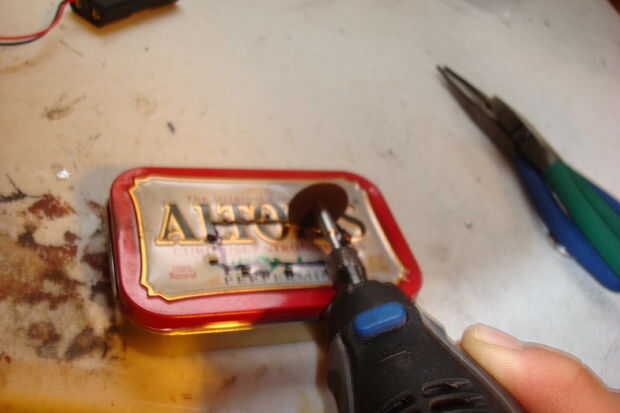 elegí un altoids lata, lo suficientemente pequeño como para un niño pequeño a mantener y lo suficientemente grande para la baterías y el timbre. Primero asegúrese de que se caben todos y luego cortar un agujero de sólo lo suficientemente grande como para que los LEDs e interruptores mirar hacia fuera. Asegúrese de que usted lija los bordes muy bien luego seguir al paso siguiente.