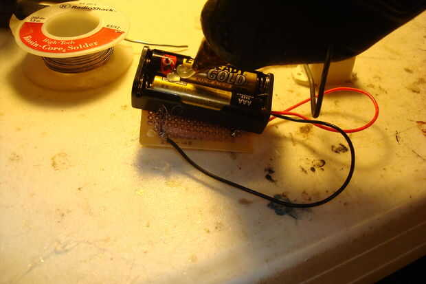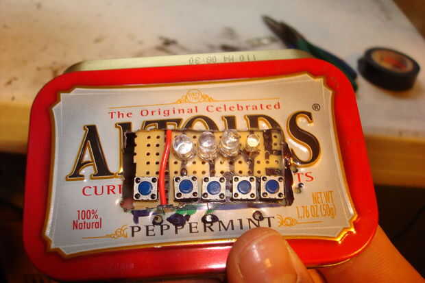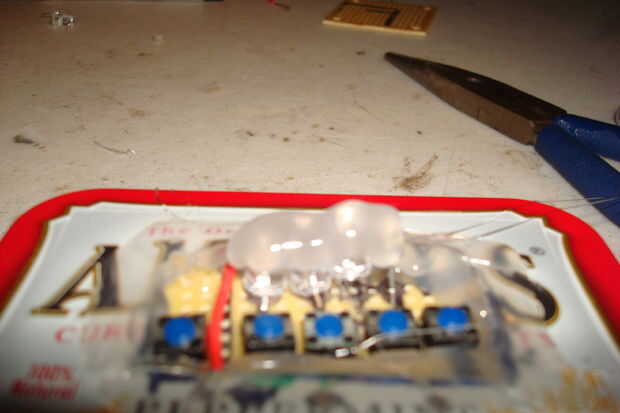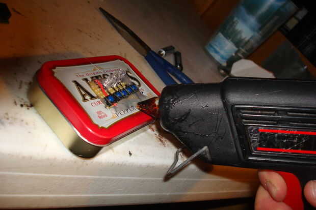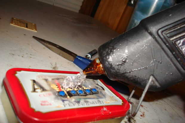 Tener todo listo antes de empezar a pegamento (pegamento caliente puede secar molesto rápido) primero pone pegamento en la placa de la PC en donde se adhieren (rápida) y por ponerlo en su lugar, una vez que el pegamento seque pones pegamento alrededor de él en el exterior (Asegúrese de obtener todos los bordes cortados y cubrirlas muy bien) cuando tienes todo pegado en el pozo , difundir los LEDs con hotglue. Cubro todos juntos para que se vea genial al encender las luces. Cuando todo lo demás hecho pegamento tienes la lata Altoids cerradas (sí cerrado) para que los niños no pueden abrirlo y llegar a nada. (por esta razón desea baterías resh que se pegan abajo)
