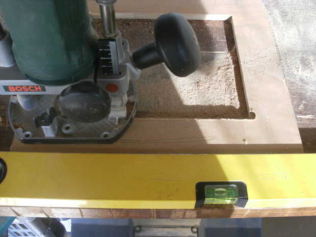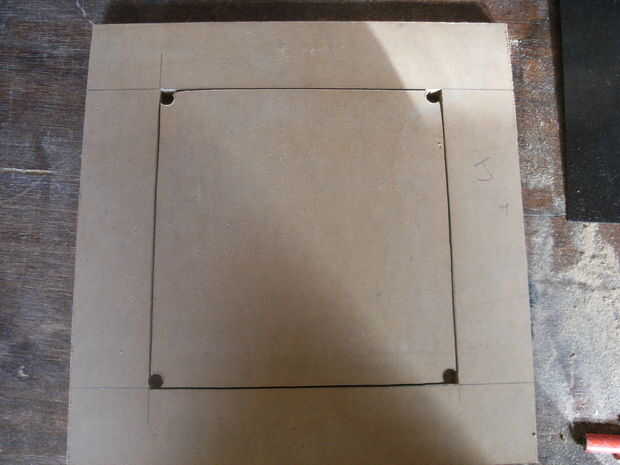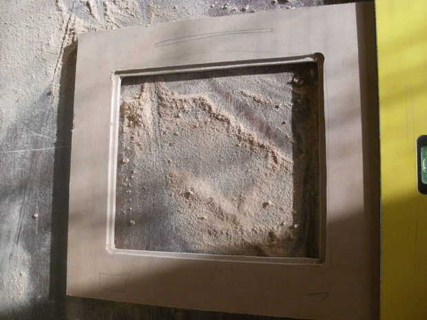 corte MDF de 12mm a 273 mm x 300 mm, el tamaño de la ventana marcada dando un borde de 50mm y corta con sierra caladora. Luego use un router con ronda sobre pedacito en todos los bordes.