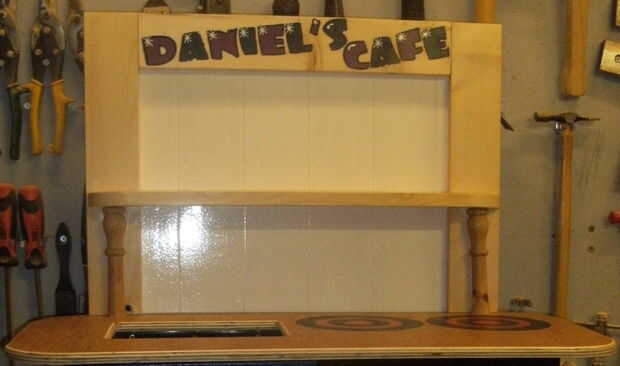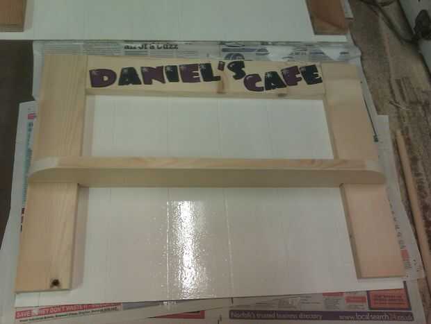 Una vez construidos, se añadió el signo personalizado. Imprimí el signo en el equipo, garabateado sobre la espalda con un lápiz suave y luego dibujó sobre las letras para transferirlo a la madera. Luego fue pintado en, bordes con marcador negro y destacado con marcador plateado.