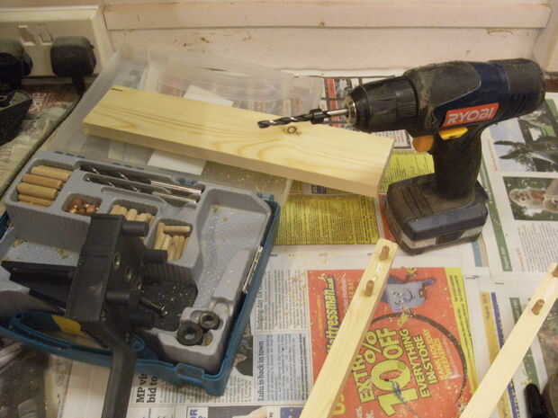 Luego cortar cuatro longitudes de 70 mm x 15 mm lumbar 2 x 400 mm (lados), 1 x 410mm (signo) y 1 x 550mm (estante). La tabla debe tener un labio a la izquierda en la parte inferior una vez enmarcada. La lumbar estructura fue perforada, unida y pegada juntos antes de ser fijado a la tabla. El estante tiene sus extremos redondeados para seguridad. Para soporte adicional debajo del estante dispone de algunos patas decorativas. Estos fueron cortados de algunos viejos ejes de escalera. El estante se atornilla por detrás como son el patas decorativas.