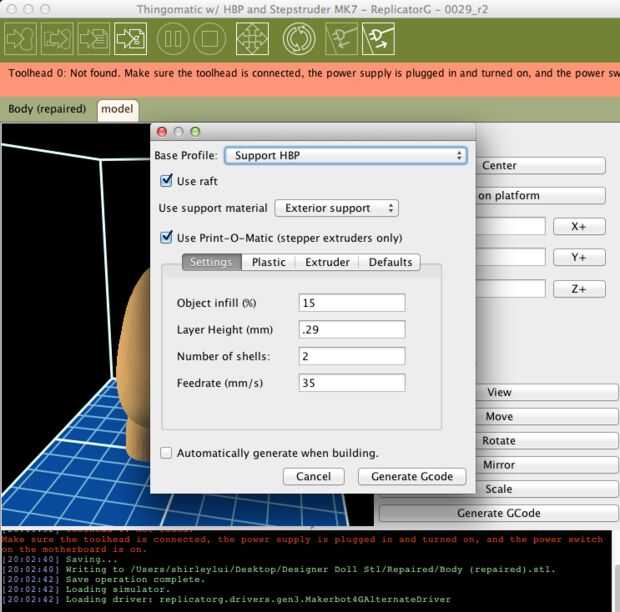A continuación para los brazos, utilizan soporte ABS material allí está un gran tutorial para hacer un ajuste en la Página Web de makerbot aquí http://www.makerbot.com/blog/2011/06/27/makerbot-microtip-using-the-support-features-in-skeinforges-raft-tool/ como hacer mis propio nuevos valores base para "Apoyo materiak"