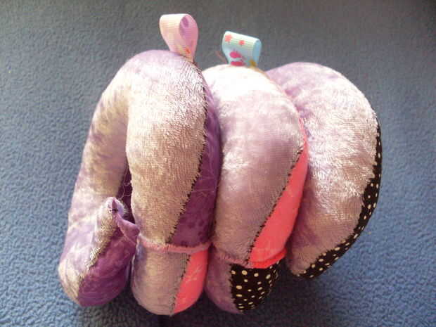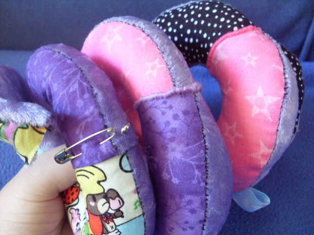 luego pasar a coser y pinnng el donut siguiente en la secuencia. el extremo abierto de cada enlace será siempre en el mismo lado y el tercero se une como hiciste con el primero.