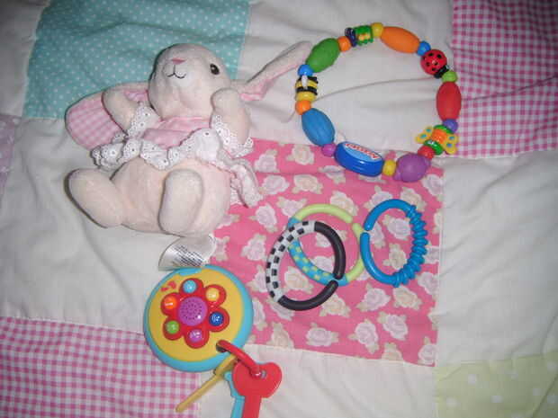 hilo de rosca espiral alrededor de su asiento de coche cuna o bebé o donde lo ponen y luego coloque los juguetes a través de los lazos.